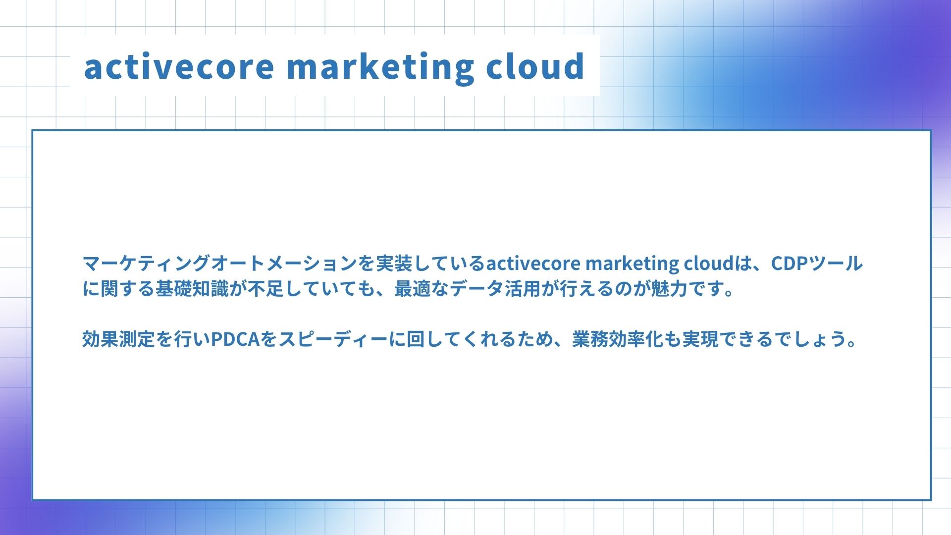 マーケティングオートメーションを実装しているactivecore marketing cloudは、CDPツールに関する基礎知識が不足していても、最適なデータ活用が行えるのが魅力です。効果測定を行いPDCAをスピーディーに回してくれるため、業務効率化も実現できるでしょう。