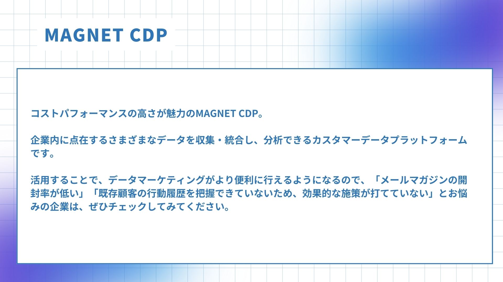 コストパフォーマンスの高さが魅力のMAGNET CDP。企業内に点在するさまざまなデータを収集・統合し、分析できるカスタマーデータプラットフォームです。