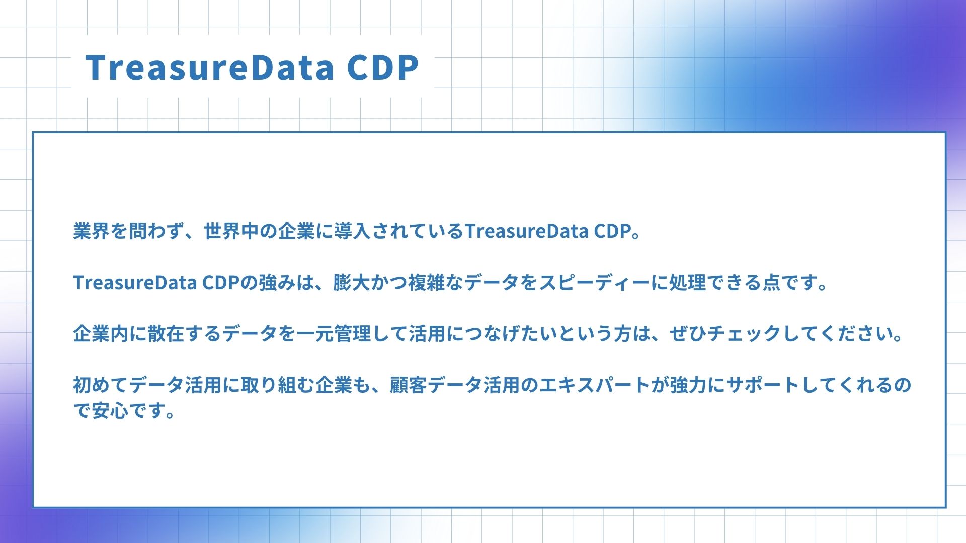 TreasureData CDPの強みは、膨大かつ複雑なデータをスピーディーに処理できる点です。企業内に散在するデータを一元管理して活用につなげたいという方は、ぜひチェックしてください。